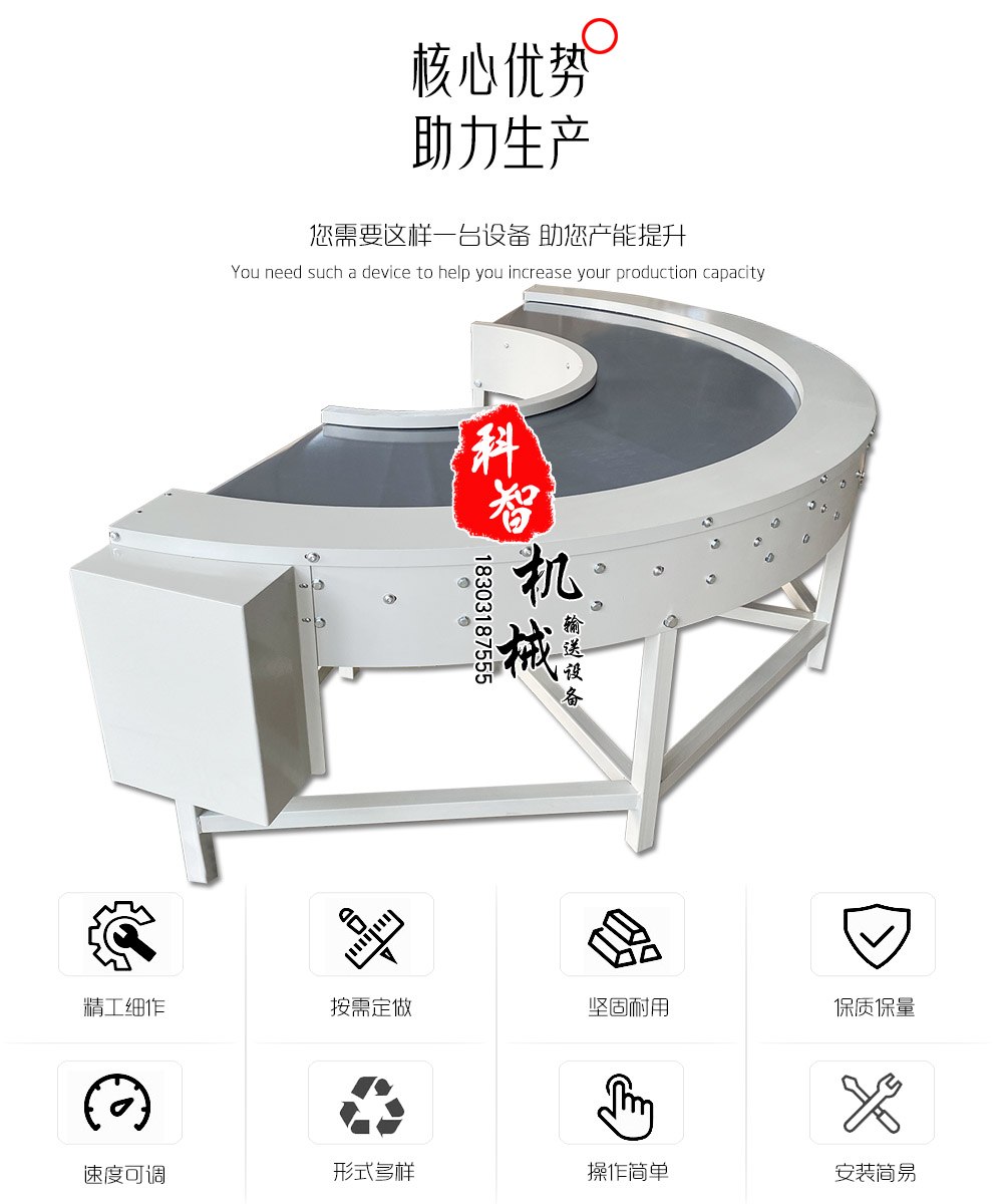 转弯机构用于改变输送物的运输方向,从而构成合理的物流输送系统,提高厂房利用率。为车间设备设置增加了很大的灵活性,可实现两条输送带间转变的连接。 转弯半径根据要求而定,速度可调。